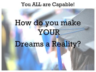 This document provides information to help students plan their life after high school. It discusses the different types of post-secondary degrees like certificates, associate's, bachelor's, and graduate degrees. The document also outlines options like attending the military, community college, or a four-year university. Key details are provided around choosing a major and minor, being a successful full-time student through good time management and involvement, applying for financial aid and scholarships, and deciding on a college by the May 1st deadline. The overall message is that higher education beyond high school is necessary to achieve one's career dreams and goals.