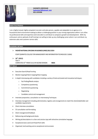 Sashmita Sreedhar is seeking a challenging position utilizing her professional skills and extensive experience in sales, customer service, and recruitment. She has over 3 years of experience working as a Resource Executive for Randstad Middle East and Recruitment Consultant for Oil & Gas for SThree. Her skills include executive search, interviewing candidates, client management, and Microsoft Office. She holds a Higher National Diploma in Business and is proficient in English, Hindi, Malayalam, and Marathi.