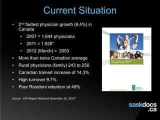 - Saskatchewan has experienced rapid physician growth in recent years, with the number growing over 8% from 2007 to 2011. However, recruitment needs are projected to be high over the next decade to keep up with population growth and replace retiring physicians.