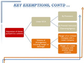 3. It addresses issues around claiming exemptions under the Takeover Code regulations, applicability of regulations to indirect acquisitions such as those through a scheme of arrangement, and factors to consider for investment decisions that may invoke the Takeover Code.