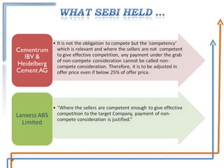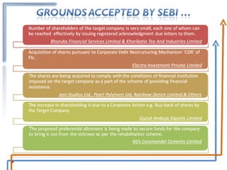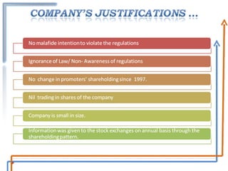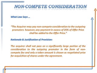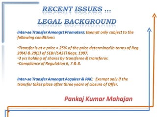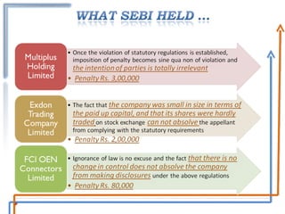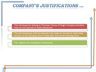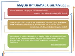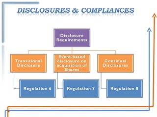 1. The document discusses various regulations under the SEBI Takeover Code regarding disclosure requirements and compliance obligations when acquiring shares or voting rights in an Indian listed company beyond certain thresholds.