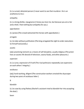 1) It defines words like abjure, abrogate, acerbic, and acrimony and provides examples of how each word can be used in a sentence.