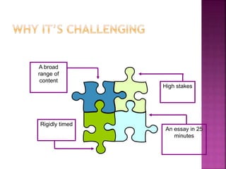 The document provides information about the structure and content of the SAT exam. It notes that the exam has sections on critical reading, mathematics, and writing. The critical reading section includes sentence completions and reading comprehension questions. The math section includes multiple choice and grid-in questions. The writing section includes identifying errors, improving sentences, and improving paragraphs. It also includes an experimental section and a 25-minute essay. It provides details on scoring, noting students receive points for correct answers and lose partial points for incorrect multiple choice answers. The overall maximum score is 2400.