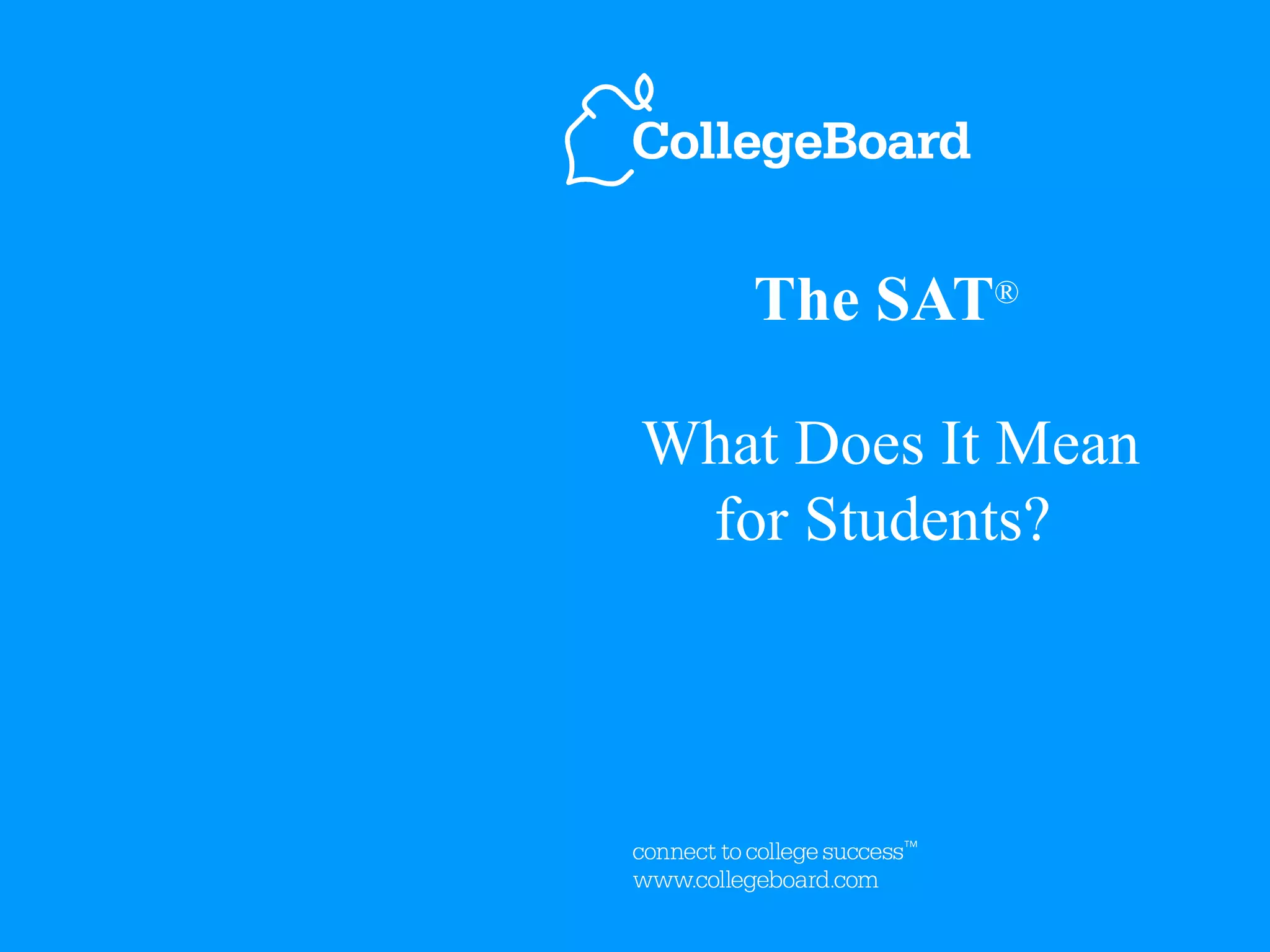 The SAT is a standardized test that measures critical reading, mathematics, and writing skills. It takes 3 hours and 45 minutes to complete and tests skills developed in high school coursework. While it covers a broad range of math concepts, the difficulty level has not increased despite the test being longer. Students should prepare by taking challenging courses, reading and writing regularly, and familiarizing themselves with the SAT format and scoring.