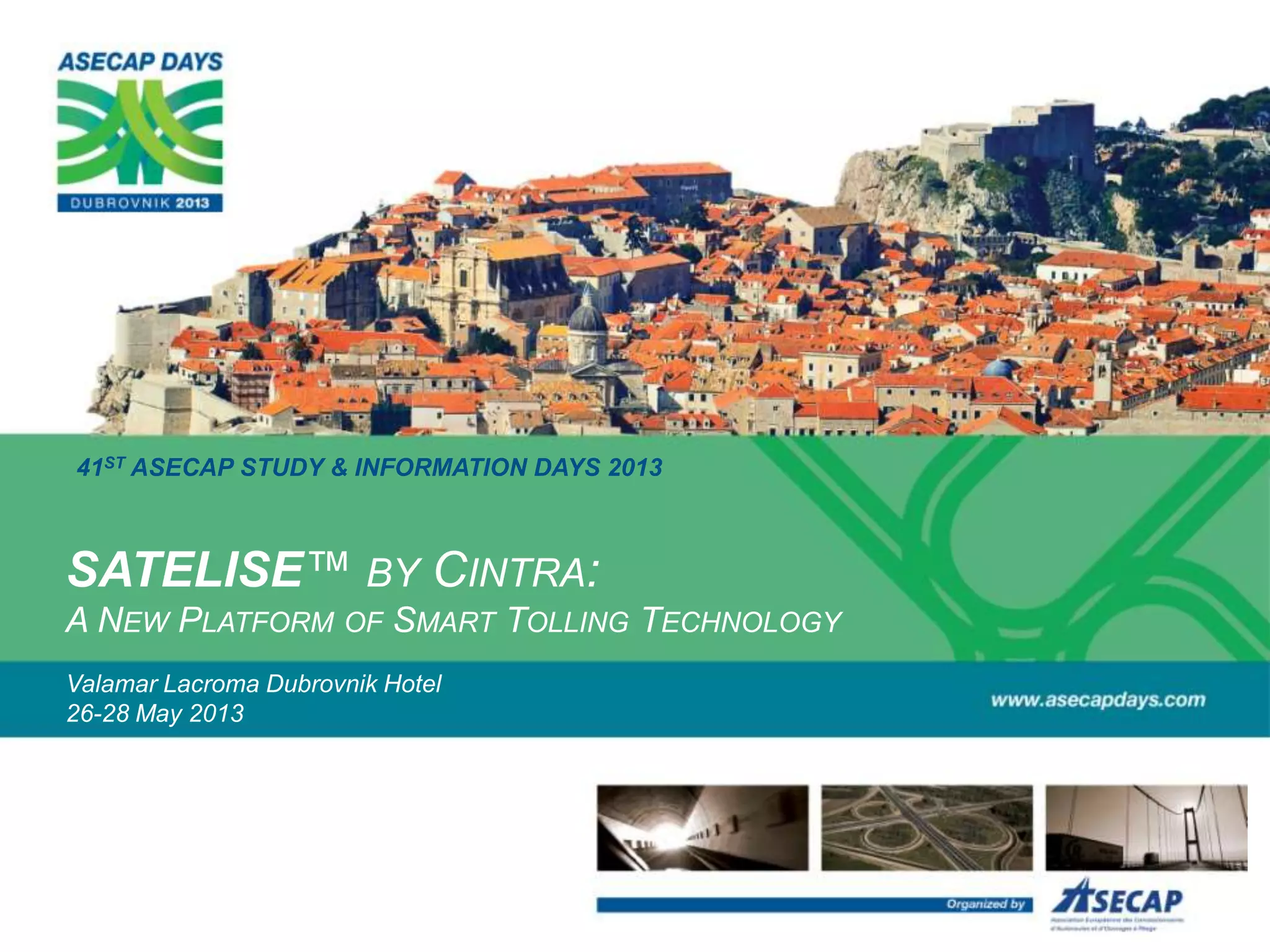 The document discusses Satelise, a new smart tolling technology platform developed by Cintra. Satelise uses smartphones with GPS capabilities as on-board units for tolling. It allows for distance-based tolling on roads and reduces the need for physical toll infrastructure. Satelise has conducted over 7,000 test transactions with near 100% accuracy. Cintra plans to conduct pilot projects with real users and payments by the end of 2013. The platform also has potential for additional features like providing traffic/weather information and loyalty programs to drivers.
