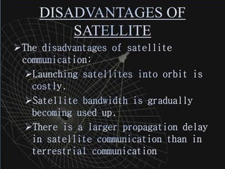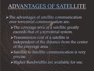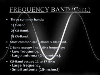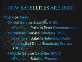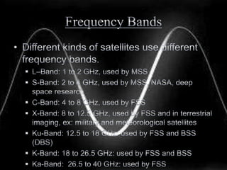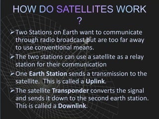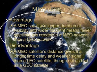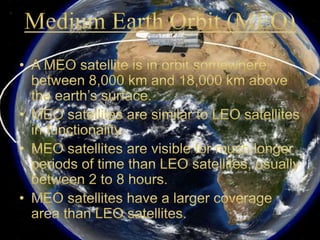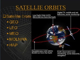 1) The types of satellites used including geostationary satellites (GEO) and low earth orbit satellites (LEO). GEO satellites orbit 35,863 km above the earth's surface and remain fixed, while LEO satellites range between 500-1,500 km and do not remain fixed.