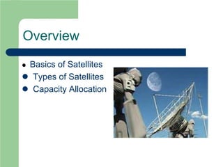 Satellite communications uses satellites as relay stations to transmit signals between Earth stations that are too far for conventional terrestrial communication. There are different types of satellite orbits - GEO satellites remain fixed over one point on the equator, while LEO and MEO satellites have shorter visibility periods from Earth. Different frequency bands are used depending on the satellite application and orbit. Capacity on satellites can be allocated using FDMA, which divides bandwidth into frequency channels, or TDMA, which divides signals into time slots.