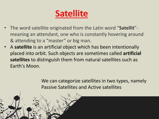 The document categorizes satellites into passive and active types, explaining their roles in communication systems. It provides a brief history of satellite launches, including significant milestones like the launch of Sputnik and India's first communication satellite, Aryabhata. Additionally, it details various orbit categories and introduces concepts like the Global Positioning System (GPS) and stratellites.