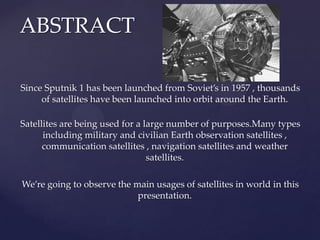 Satellite applications can be categorized into four main types: communication satellites, navigation satellites, observation satellites, and weather satellites. Communication satellites allow for radio, television, and telephone transmissions globally. Navigation satellites like GPS use timing signals from satellites to precisely determine location. Observation satellites are used for non-military purposes like environmental monitoring and map making. Weather satellites scan Earth with instruments to form images of cloud cover, temperatures, and weather systems.