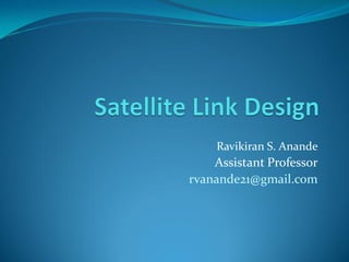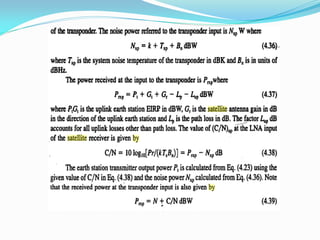 This document provides an overview of satellite communication link design. It discusses basic transmission theory including the link equation and factors that affect received power such as EIRP, path loss, and antenna gains. It also covers system noise temperature and the G/T ratio. The document outlines considerations for designing downlinks and uplinks. It describes how to calculate overall C/N ratio when multiple C/N ratios are present in the link. Finally, it lists the typical steps involved in designing a satellite communication link for a specified C/N requirement.