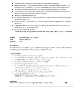 This document contains a summary of Sathish Selvaraj's career profile and experience as a Senior Software Engineer. He has over 5 years of experience developing software for the airline and banking industries using technologies like Java, Spring, Hibernate, and more. His roles have included automating reports to save a bank $100 million, enhancing software during an airline merger, and currently serving as a module lead developing reporting systems for an asset management firm using tools like POI, JXLS, and Drools.