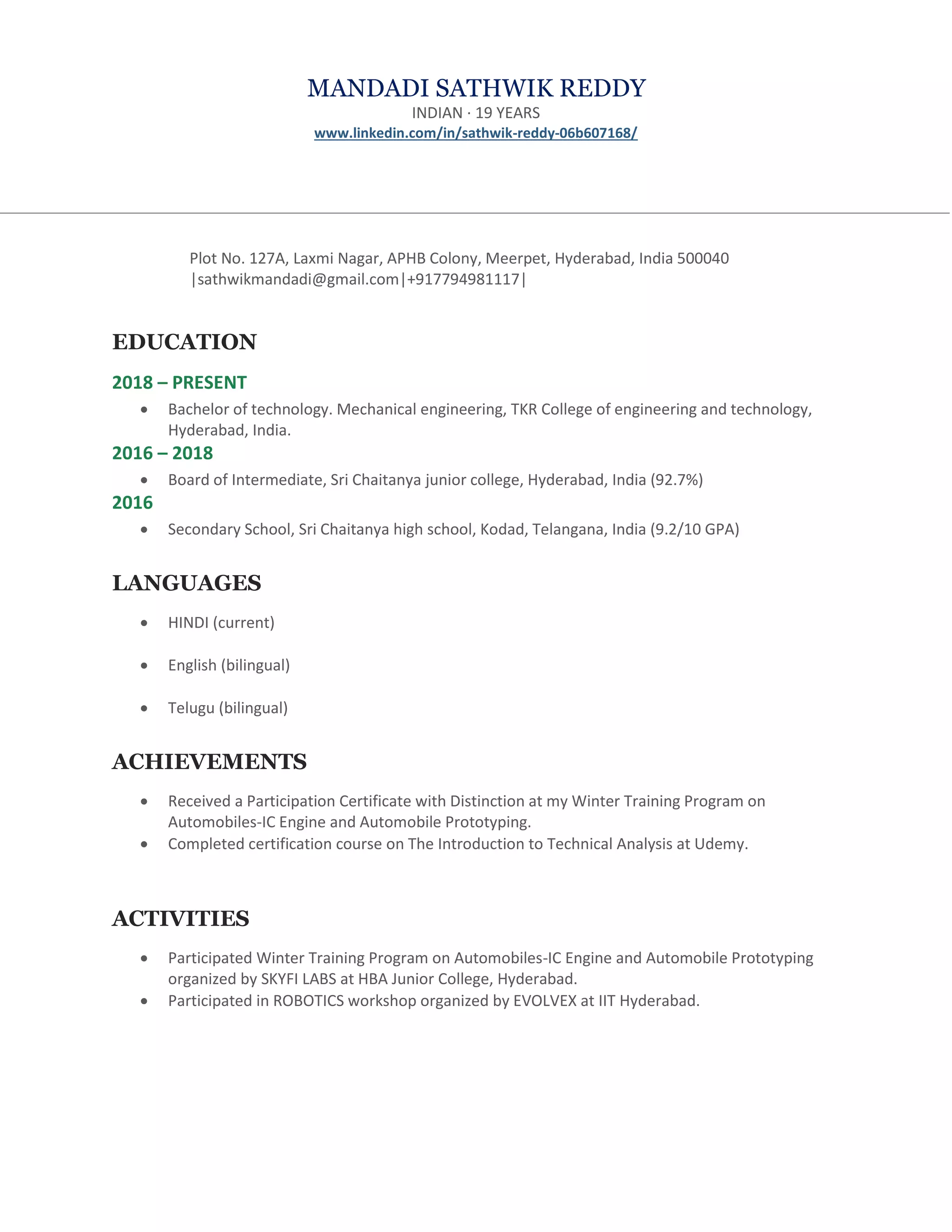 Sathwik Reddy is a 19-year-old Indian student currently pursuing a Bachelor of Technology in Mechanical Engineering at TKR College of Engineering and Technology in Hyderabad, India. He received high marks in his intermediate and secondary education. Sathwik is trilingual in Hindi, English, and Telugu. He has participated in training programs in automobiles and robotics. Additionally, Sathwik has taken on responsibilities as an Internshala student partner and as a branch ambassador for his college's technical festival. His interests include music, reading, volunteering, and creative writing.