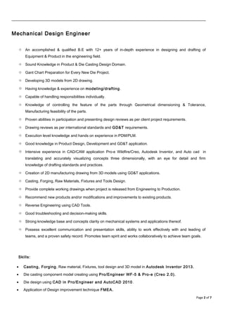 Sathya Moorthy provides his curriculum vitae, which includes a 12+ year history working as a mechanical design engineer specializing in product and die casting design. He has extensive experience using CAD software like Pro-E, Creo, Autodesk Inventor, and AutoCAD to design parts and create technical drawings. Currently he works as a senior design engineer performing drawing quality checks for Caterpillar according to their engineering standards.