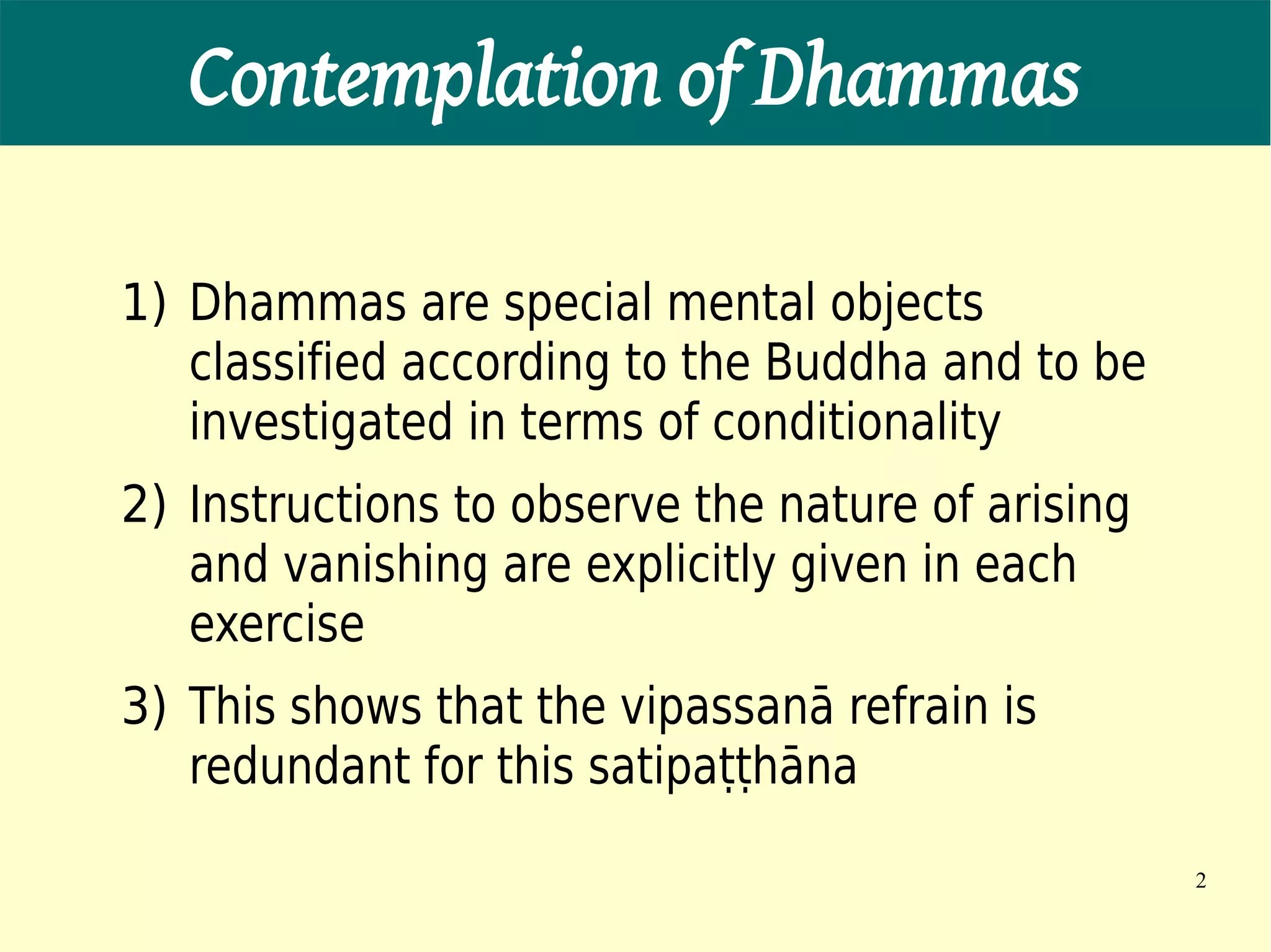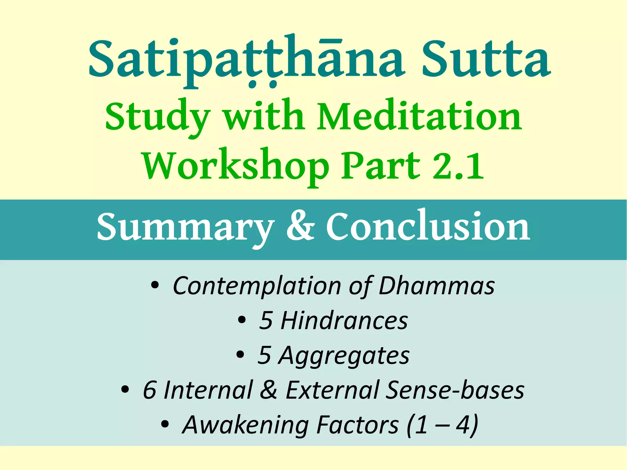 The document focuses on the Satipaṭṭhāna Sutta and various meditation techniques, detailing contemplation of dhammas, overcoming 5 hindrances, understanding 5 aggregates, and utilizing 6 internal and external sense-bases for spiritual development. It emphasizes the need for a composed mind for effective practice and the importance of awakening factors, which extend beyond the sutta itself to include diverse meditative practices. Ultimately, it outlines a framework for mindfulness and insight necessary for personal growth and understanding in meditation.