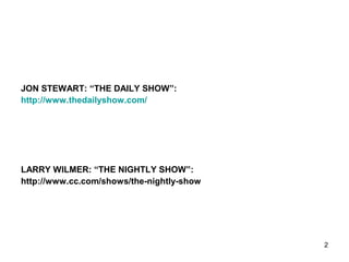 This document provides an overview of satire, including its definition, history, forms, and purposes. It discusses various satirists across different eras and mediums, from ancient writers like Aristophanes and Juvenal to modern television shows, novels, and comedians. Key points covered include the distinction between Horatian and Juvenalian satire, how satire can be a tool for social commentary and reform, and how it uses humor, irony and ridicule to critique individuals and institutions. Examples discussed range from Aristophanes' anti-war play Lysistrata to Jonathan Swift's "A Modest Proposal" to modern political satirists like John Oliver, Stephen Colbert and Bill Maher
