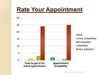 The Lourdes Center for Mental Health conducted a customer satisfaction analysis based on responses from 28 patients. Survey results showed that patients were generally satisfied with appointment availability, the friendliness of staff, and their counselors and doctors. Areas identified for improvement included counselors explaining things in a complex manner for some patients and not always being on time for appointments. Some patients also left positive comments, praising specific staff members for providing helpful care and treating them with respect.