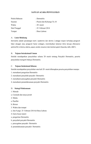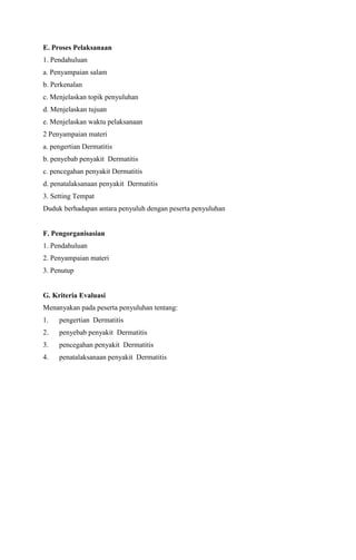 Dokumen tersebut merupakan rencana pelaksanaan penyuluhan tentang penyakit dermatitis kepada pasien dan keluarganya selama 20 menit. Penyuluhan akan membahas pengertian, penyebab, pencegahan, dan penatalaksanaan dermatitis serta dievaluasi untuk mengetahui tingkat pemahaman peserta.