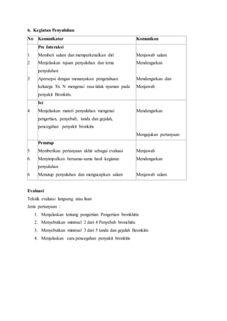 Dokumen ini berisi rencana penyuluhan tentang bronkitis untuk keluarga Tn. N, dengan tujuan utama agar mereka memahami dan dapat merawat anggota keluarga yang menderita penyakit ini. Penyuluhan mencakup pengertian bronkitis, penyebab, tanda-tanda, gejala, serta cara pencegahannya, dan akan dilakukan melalui ceramah dan diskusi. Evaluasi dilakukan dengan pertanyaan lisan terkait pemahaman materi oleh peserta.