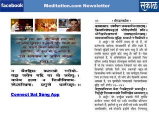 The document discusses a meditation.com newsletter that promotes a new Connect Sat Sang web app. The newsletter includes a timeline of content pages that provide information about the Satsang web app, with page 1 through page 4 outlined and a link to go to the app's content page.