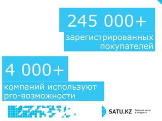 Документ представляет новые возможности платформы satu.kz, включая рост зарегистрированных покупателей и использования мобильного трафика. В нем описаны улучшения в обработке заказов, управлении категориями и дизайне, а также возможности e-mail рассылок и отзывы от клиентов. Также упоминается о партнёрских отношениях и условиях продажи товаров.