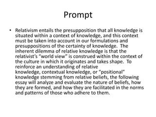 The document discusses the concept of relativism and relative knowledge, which holds that knowledge is situated within a specific context and must be understood within that context. It notes that a dilemma of relative knowledge is that a relativist's worldview is shaped by their own culture. The essay aims to analyze beliefs, how they are formed, and how they are influenced by social norms in order to reinforce the understanding of relative and contextual knowledge.