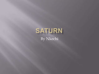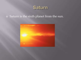Saturn is the sixth planet from the sun and the largest planet in the solar system, being ten times larger than Earth. It takes 29.5 years to orbit the sun and has 31 satellites, with rings made of ice particles that can be seen with the naked eye.