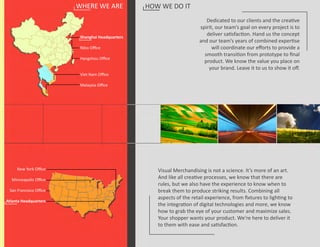 Saturn Display is a global retail design and manufacturing company with offices worldwide. They have expertise in visual merchandising, retail design, product manufacturing, shipping, and safety compliance. Their goal is to turn clients' concepts into high-quality, store-ready products that grab customers' attention and maximize sales through strategic retail design.
