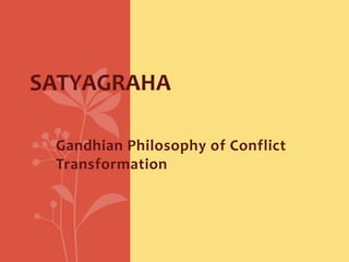 Satyagraha is a philosophy of non-violent civil disobedience developed by Gandhi. It is based on the concepts of truth, non-violence, and self-suffering. The goal is to achieve truth through non-violent means even in the face of violence or oppression. Truth is a relative concept defined as resolutions that fulfill human needs for freedom and integrity. Non-violent actions are used to test differing views of truth, and may lead to suffering being imposed on practitioners by opponents, to which practitioners refuse to retaliate and instead invite more suffering upon themselves.