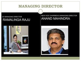 The document discusses the Satyam scandal involving its former Chairman Ramalinga Raju. It provides details of the financial irregularities confessed by Raju, including inflated cash and bank balances, non-existent accrued interest, understated liabilities and overstated debtors. Raju claimed that neither he nor the managing director benefited financially and that none of the board members were aware. The document also examines who else could be culpable such as the auditors and regulators. It outlines steps the management could take to rebuild confidence including changing the company name and appointing a new board. Finally, it mentions that Tech Mahindra acquired a 31% stake in Satyam Computer Services for Rs. 1757 crore.