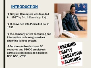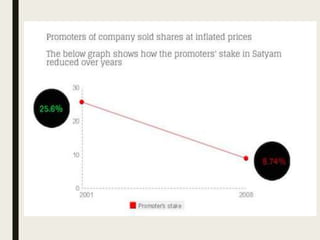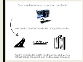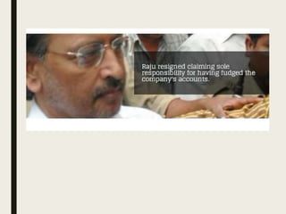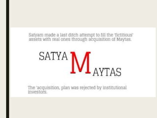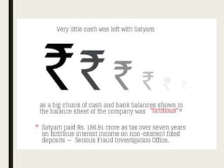The Satyam scam was one of India's biggest corporate frauds, where the founder of Satyam Computers, Ramalinga Raju, confessed in 2009 that the company's accounts had been falsified. Raju and others had inflated revenues and profits through fake invoices and bank statements, deceiving investors and auditors. A whistleblower's email exposed the fraud of over $1 billion in inflated cash reserves. Raju and others were found guilty of fraud and sentenced to prison. The scam had major consequences, devastating Satyam and impacting India's economy, IT sector, and corporate governance standards.