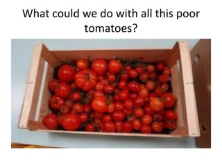 The document discusses using leftover tomato sauce that nobody wants to prepare pasta or bruschetta instead of letting it go to waste. It suggests cooking and using the tomato sauce and putting any leftover peels in the composter in the garden to avoid wasting food.