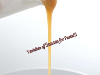 The document describes several popular sauces used for pasta, including fettuccine alfredo made with heavy cream, butter, parmesan cheese, and parsley; arrabiata sauce made with olive oil, onion, garlic, red chilies, tomato paste, and balsamic vinegar; and bolognese sauce made from a combination of meats, vegetables, tomatoes, milk or cream, and seasonings that is simmered for hours. Methods of preparing each sauce are provided.