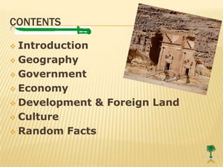 Saudi Arabia is located on the Arabian Peninsula with a population of 27.6 million. It has a harsh desert climate and relies heavily on oil, which accounts for 75% of its budget revenues. Saudi Arabia is an absolute monarchy that is governed by Islamic law and does not allow political parties or national elections. While oil drives its economy, the government is pursuing economic diversification through projects like the new King Abdullah Economic City. Saudi culture strictly follows Islamic traditions, with the holiest sites of Mecca and Medina located there.