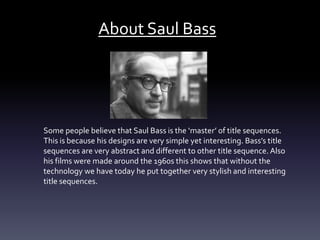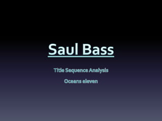 Saul Bass was a pioneer in title sequence design in the 1960s, creating abstract, stylish sequences without advanced technology. His sequences for Oceans Eleven featured simple lighting that represented casinos. The sequence gives viewers impressions of themes like gambling, wealth, and law-breaking that will appear in the film. The upbeat 1960s-style music reinforces the upper-class setting of casinos in America.
