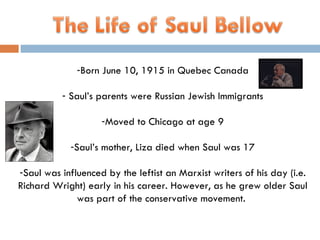 - Saul Bellow was born in Canada in 1915 to Russian Jewish immigrants and moved to Chicago at age 9. He was influenced by leftist writers early in his career but became more conservative over time.