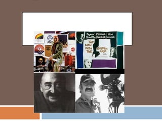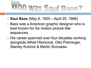 Saul Bass was an American graphic designer best known for his pioneering motion picture title sequences over four decades working with famous directors. He began doing print work for films but created impressive title designs for Otto Preminger's 1954 film Carmen Jones, realizing titles could set mood and express the film's story metaphorically to emotionally resonate with audiences. Bass became popular for his controversial title sequence for The Man with the Golden Arm featuring an animated paper cut-out arm of a heroin addict, matching the film's taboo subject of addiction. He was truly an innovative designer who used visuals and text to communicate stories.