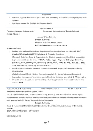 This document contains the resume of Saumik Pal, who has over 7 years of experience in sales and marketing roles for telecom and ERP software companies. He has worked in India, the Middle East, Africa, and other parts of Asia. Some of his responsibilities have included managing sales cycles, structuring deals, requirements analysis, and account management. He has expertise in ERP software like Microsoft Dynamics and Oracle applications as well as telecom solutions. His educational background includes an MBA and a bachelor's degree in information technology.
