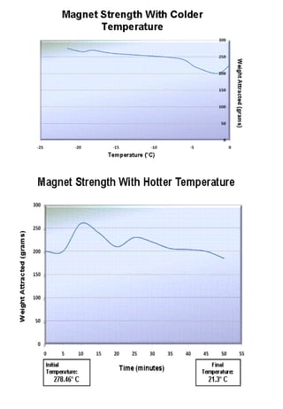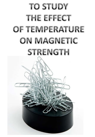 Saurav Pandey, a class 12 student, conducted an experiment to determine the effect of temperature on the strength of a magnet. He hypothesized that magnetism would decrease with increasing temperature, following an exponential curve. The procedure involved measuring the mass of paperclips attracted to a magnet at various freezer and oven temperatures. Observation showed magnetism increased as temperature decreased from -21C to 0C, and decreased as temperature increased from room temperature to 50C. The conclusion was that cold strengthens magnets by slowing atomic movement and domain alignment, while heat weakens them by increasing movement and disrupting domains.