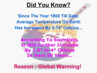 The document discusses the impacts of global warming and climate change. It notes that average global temperatures have risen 0.74° Celsius since 1800 and are projected to increase by 1.8-4° Celsius in the next 50 years due to greenhouse gas emissions. Impacts include melting ice caps and glaciers, rising sea levels that could flood coastal cities by 2100, more droughts and forest fires, reduced food production, and increased disease. Stronger hurricanes and other extreme weather in recent years provide evidence that climate change impacts have already begun.