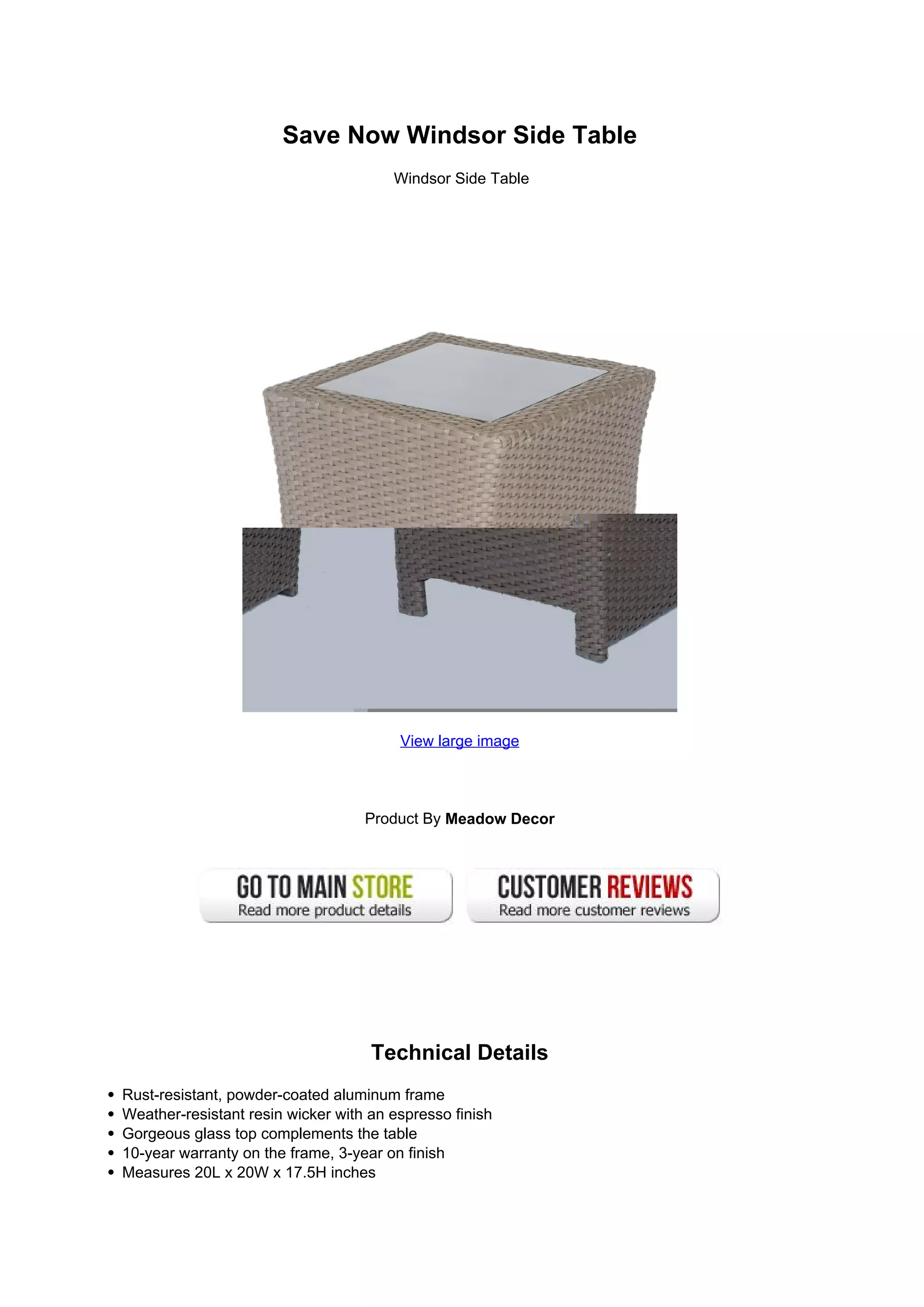 This product description summarizes the Save Now Windsor Side Table. The table features a rust-resistant powder-coated aluminum frame, weather-resistant espresso-colored resin wicker, and a glass top. It has a 10-year warranty on the frame and 3-year warranty on the finish. The Windsor side table measures 20 inches long, 20 inches wide, and 17.5 inches tall.