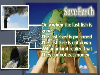 The document discusses the four main types of pollution: air, water, soil, and noise. It defines pollution as degradation of the environment caused by human activities. Various human activities that contribute to pollution are described such as factories, deforestation, and waste. The impacts of pollution on health and the environment are outlined. Solutions to each type of pollution are then provided, including recommendations for individuals, industries, and governments regarding reducing pollution at the source, recycling, and using renewable energy.