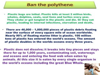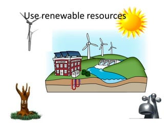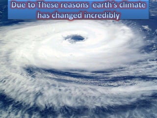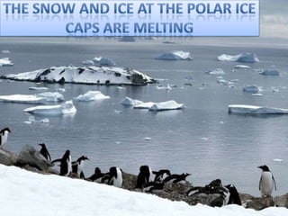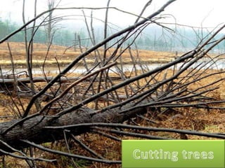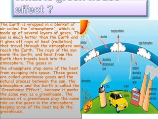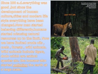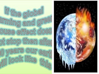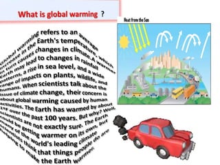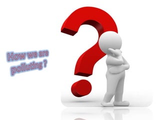 The document discusses pollution as an adverse change caused by human activities affecting air, water, and soil quality, identifying six types of pollution. It highlights the dangers of global warming, climate change, and their effects on the environment and human health. To combat these issues, the document suggests conserving water and energy, and growing more trees to help maintain ecological balance and mitigate climate effects.