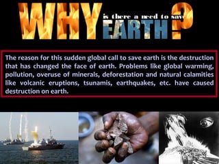 Global problems like global warming, pollution, deforestation, and natural disasters have caused destruction to the earth. This document provides tips for small actions individuals can take to help save the earth and reduce their carbon footprint, such as using compact fluorescent light bulbs, keeping tires inflated, using recycled paper, minimizing packaging waste, driving a hybrid vehicle, carpooling, planting trees, replacing old appliances, and unplugging unused electronics. Taking many small actions like these could collectively make a significant impact in reducing environmental destruction.