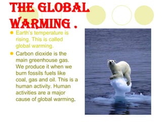 Global warming is causing the Earth's temperature to rise due to human production of carbon dioxide and other greenhouse gases from burning fossil fuels. This is melting ice, changing water and weather patterns, and threatening some animal species. To reduce these problems, people and organizations need to lower their carbon footprint by reducing emissions, recycling more, and switching to reusable and renewable resources.