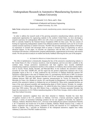 The document summarizes an undergraduate research experience program focused on automotive manufacturing systems at Auburn University. It describes how the program was developed in response to growth in the automotive industry and related employment opportunities in the southern US. It hosts 10 engineering students each summer who work on research projects related to the automotive industry. The program aims to provide research experience and encourage students to pursue advanced degrees and careers in engineering. It also aims to recruit a diverse group of students from different universities.