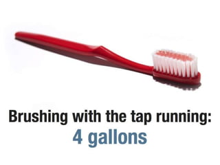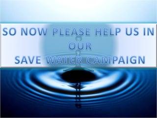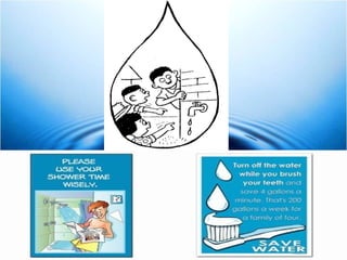 The document discusses ways for an organization called ARHAM YUVA GROUP to promote water conservation. It asks the reader to estimate daily water usage activities at home. It then provides statistics on the largest residential indoor uses of water, with toilets being the highest at 26.8% and clothes washers and showers also being major uses. It concludes by listing ways for individuals to save water, such as only running full loads for washing, turning off water when not in use, taking shorter showers, fixing leaks, and reducing toilet and showerhead flows.