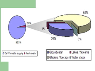 The document discusses water conservation and provides information about the water cycle, water pollution, health impacts of unsafe water, and ways to save water. It emphasizes that only a small percentage of water is available for human use and stresses the importance of conserving this precious resource through methods like rainwater harvesting, reducing water usage, and proper sanitation. Schools are encouraged to form committees to maintain clean drinking water and toilets and promote water conservation awareness.