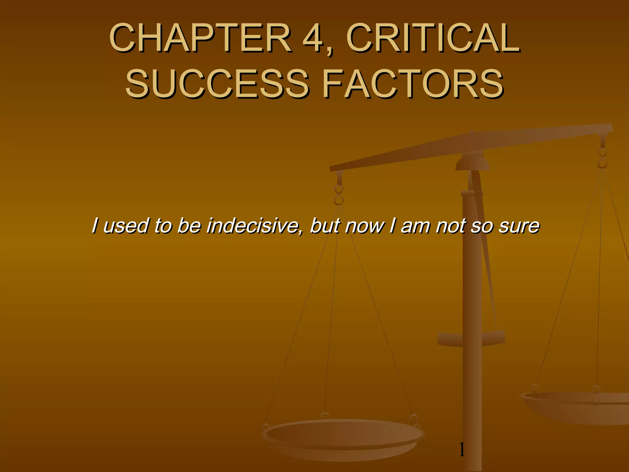 This chapter discusses critical success factors from an industry and organizational perspective. It introduces models for analyzing the industry environment, including stages of industry evolution, to identify industry critical success factors. It also presents the SWOT analysis tool to match industry factors with an organizational profile and determine strategic approaches based on the organization's internal strengths and weaknesses and external opportunities and threats.