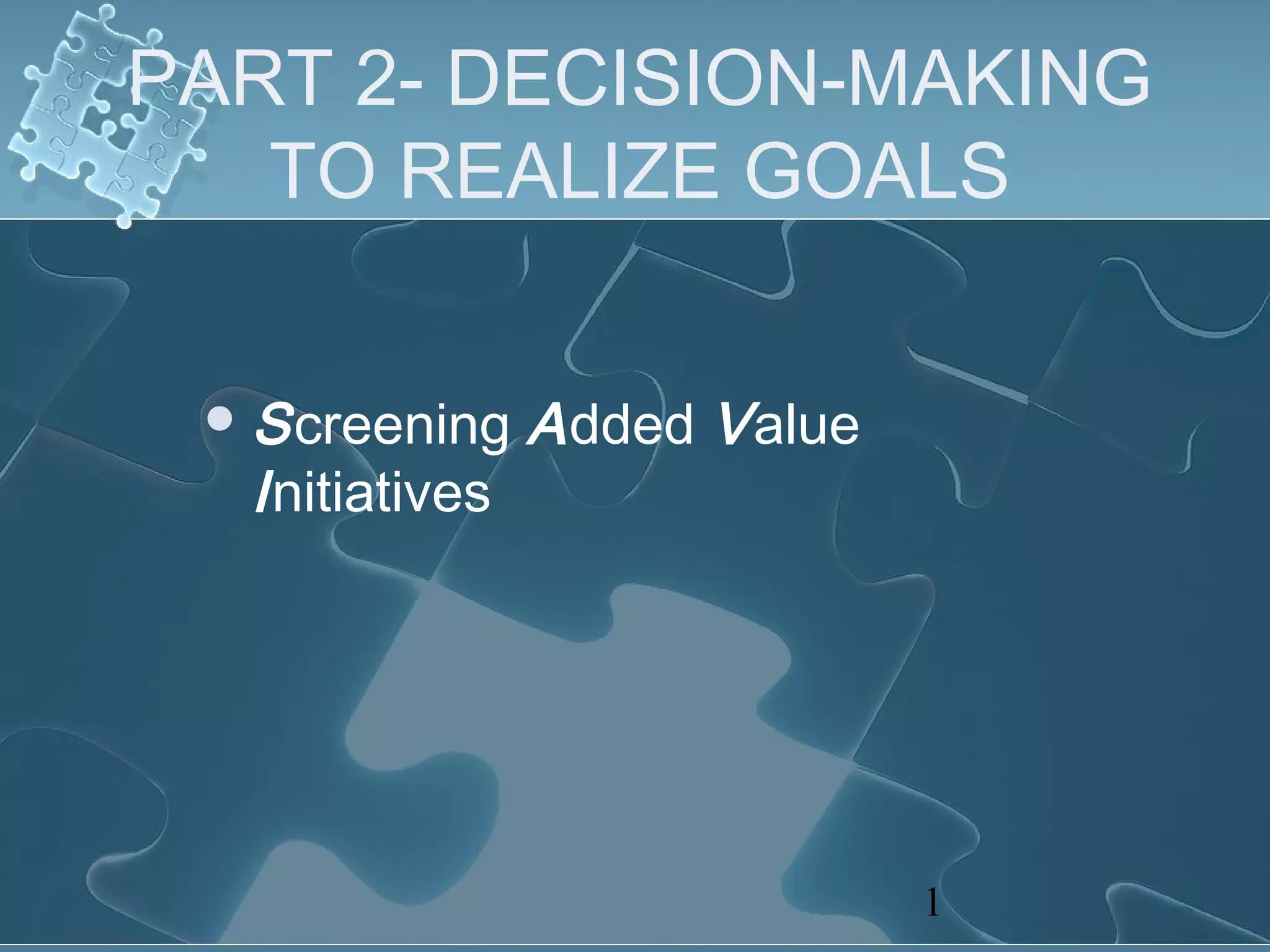 This document discusses decision-making and realizing goals through screening added value initiatives. It introduces the SAVI model for evaluating initiatives and outlines the components of a business case analysis for decision making. Key steps in the process include properly defining the problem, identifying goals and criteria, evaluating alternatives through financial and non-financial analysis, and selecting an option to implement along with follow up. The overall framework aims to systematically evaluate initiatives against strategic goals to identify the best solution.