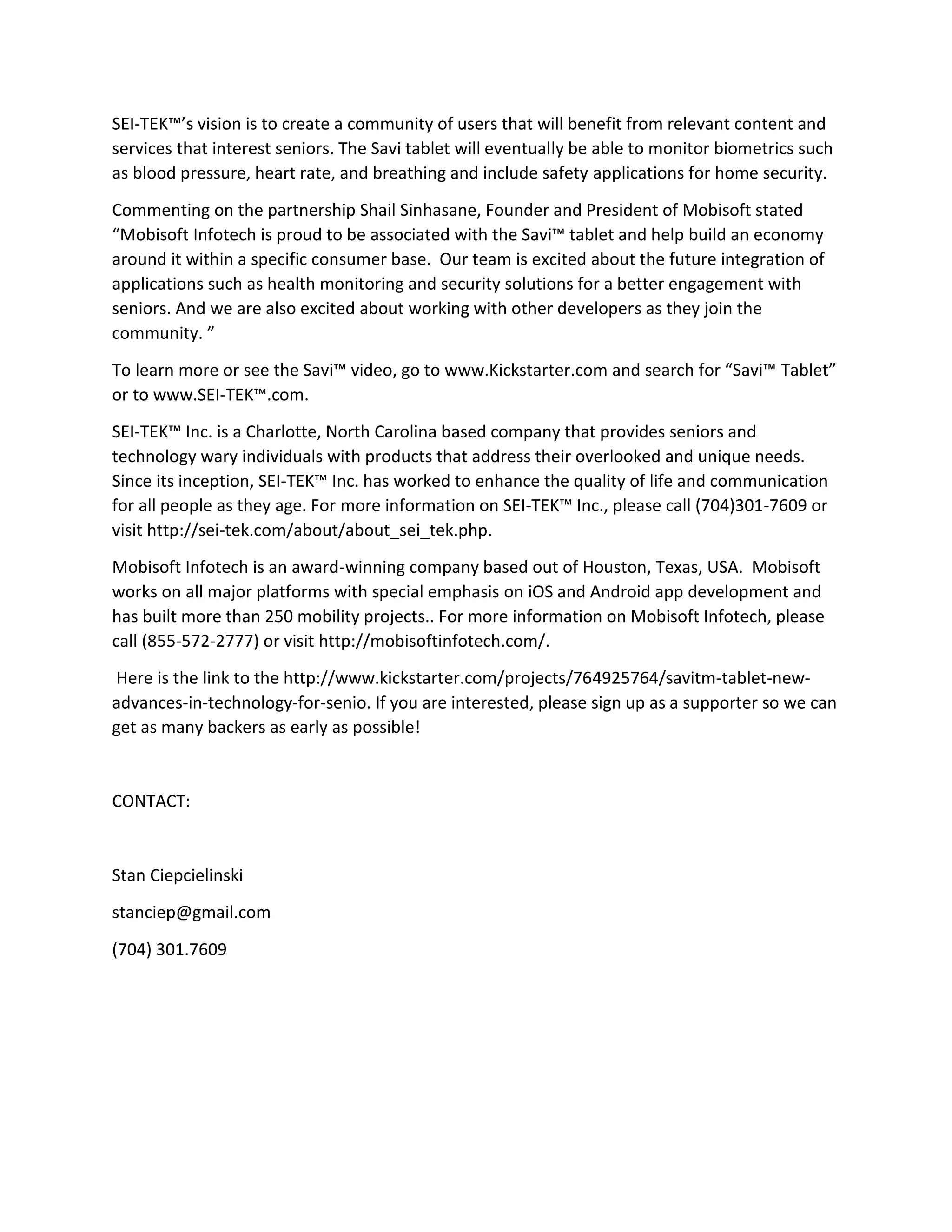 SEI-TEK Inc. is launching a Kickstarter campaign to fund their new tablet, Savi, designed specifically for seniors. The Savi tablet will have a simple, easy to use interface with large icons and fonts and high contrast. It will include applications seniors want and eventually monitor health metrics. Mobisoft Infotech will partner with SEI-TEK to develop apps for the tablet and help build a user community around it.